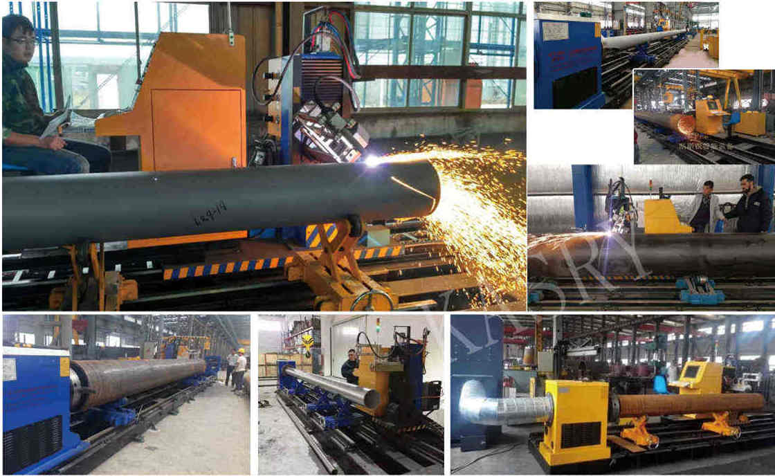 LN-XY5系列数控管子相贯线切割机是一种对钢管端部结合处作自动计算和切断的设备。该机器能广泛应用于造船、建筑、石化、机械、冶金等行业的管道结构件的切割加工。这些行业中有大量的管道结合相贯线孔、相贯线端头,还有俗称“虾米节”的弯头,此类加工大多采用制作样板、划线、人工放样、手工切割、人工打磨等落后又繁复的方法来进行。而我厂制造的KR-XY系列数控管道切割机能十分方便地切割此类工件,并且操作工人不须编程、只需输入相互配合的管子的半径、相交角度等参数,机器就能自动切割出管子的相贯线、相贯孔、以及焊接坡口,不再需要人工打磨。